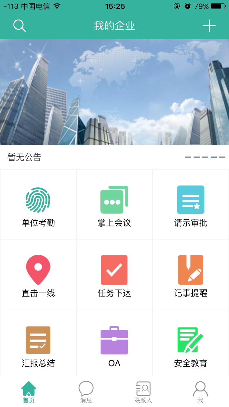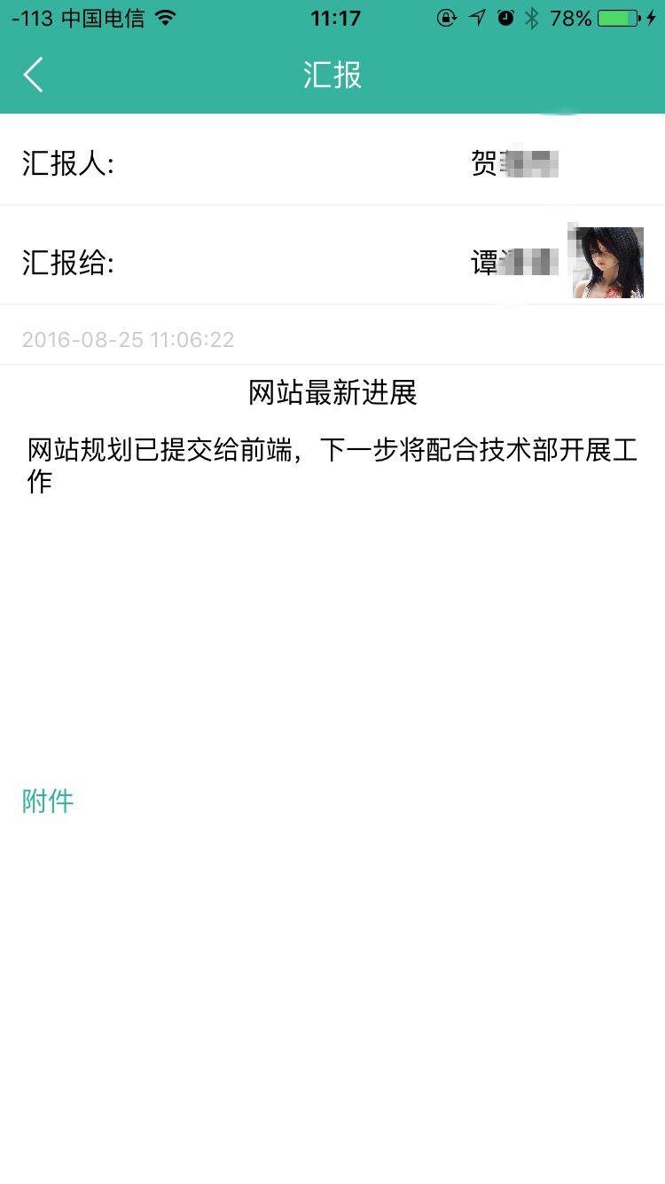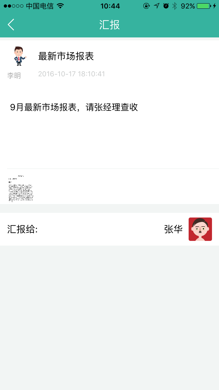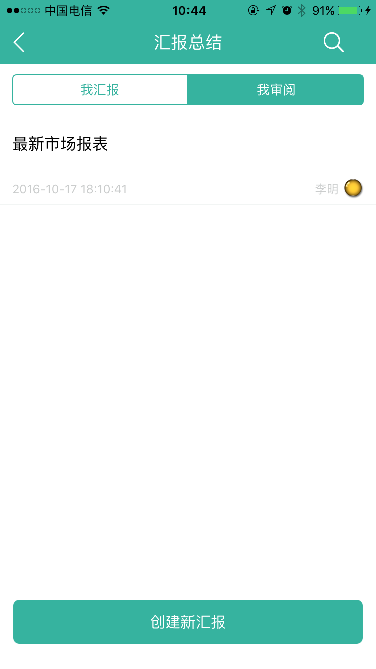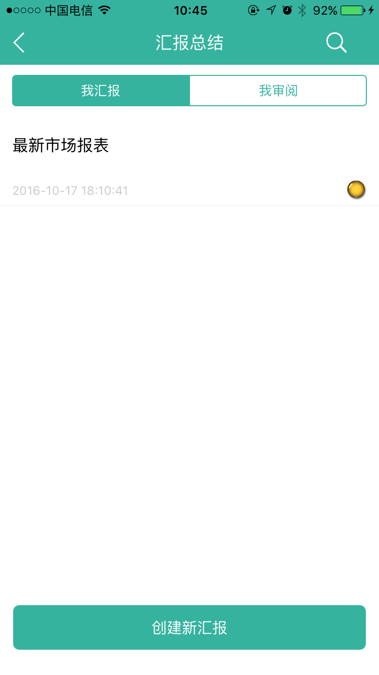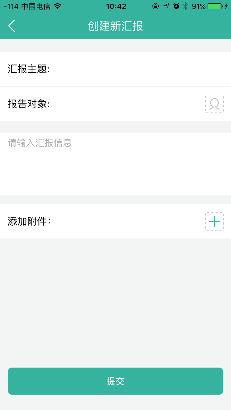 在此处查看以及创建新的工作汇报,发送汇报时可选择通讯录中的联系人并上传附件。