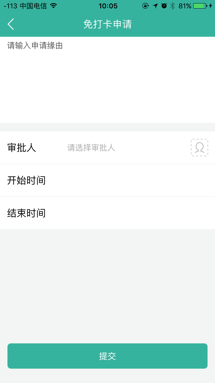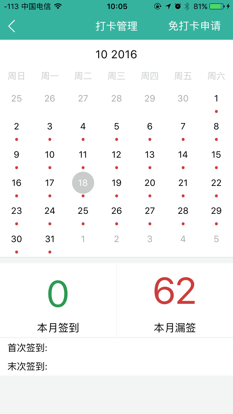 点击右上角闹钟图标可设置打卡提醒,点击日历图标则可查看本人打卡记录,若临时无法打卡,可点击按钮提交免打卡申请。