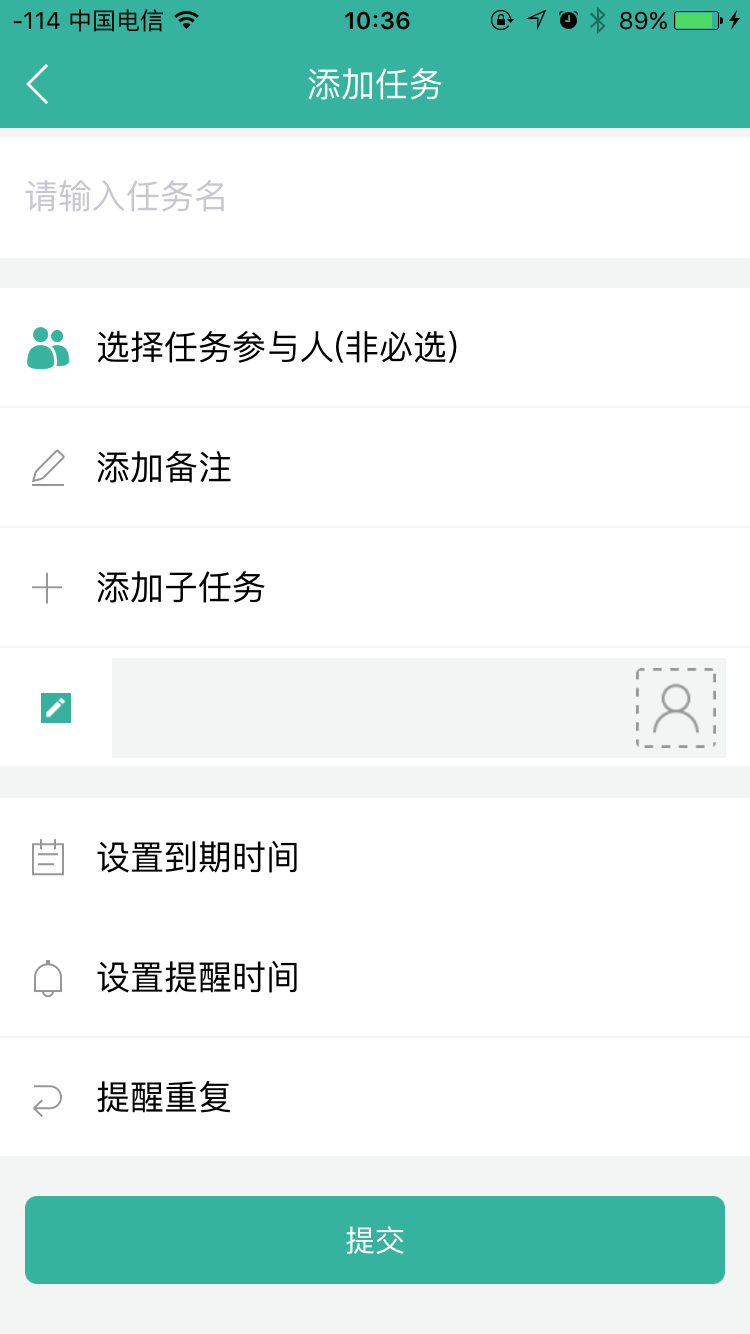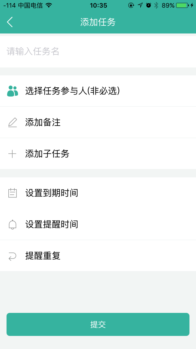 点击下方创建新任务,进入创建页面,可添加任务的具体信息、参与人、备注、子任务并设置到期时间提醒等。