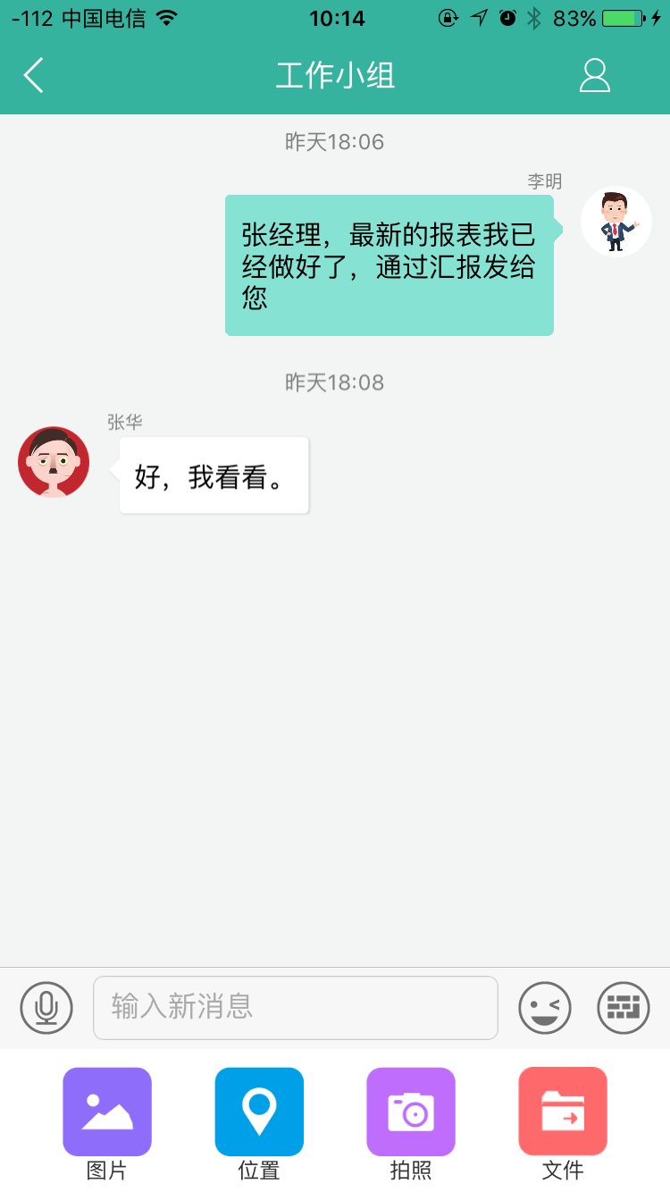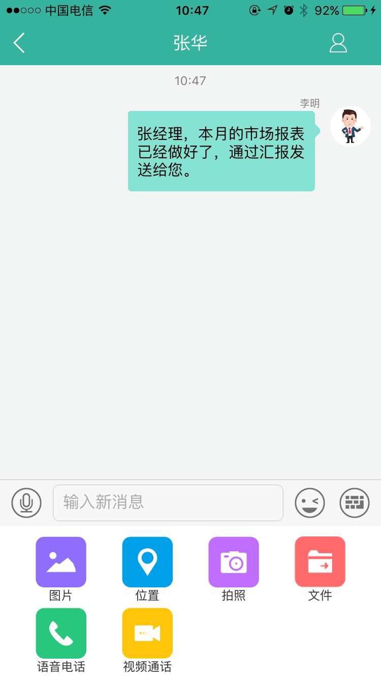 一对一即时通讯,支持发送文字、语音、图片、文件以及位置信息